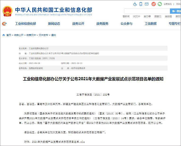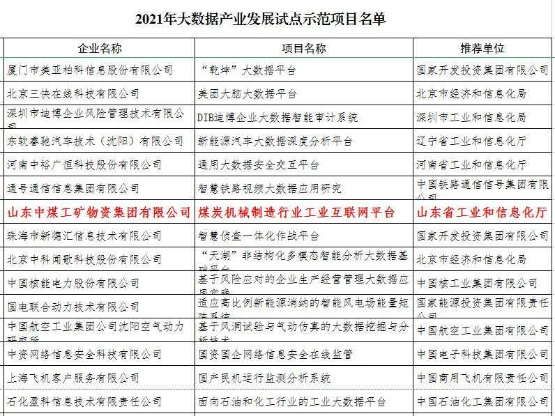 根据《工业和信息化部办公厅关于组织开展2021年大数据产业发展试点示范项目申报工作的通知》(工信厅信发函〔2021〕14号)要求,工业和信息化部组织开展了相关申报和评审工作,并于近日公布了2021年大数据产业发展试点示范项目名单。中煤集团申报的“煤炭机械制造行业工业互联网平台”被评为2021年大数据产业发展试点示范项目。