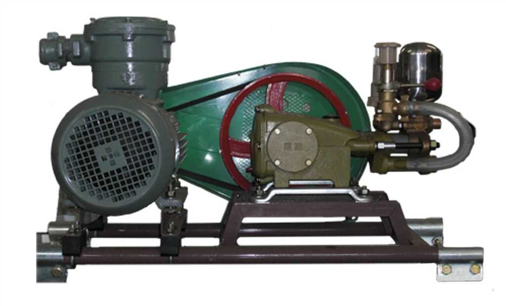 1.防灭火阻化多用泵是由3KW防暴电机用三角皮带带动液泵,从动轮以700~800r/min进行工作,液泵在曲轴转动一转时,分别在三个唧筒内的三套进水和出水阀组件的作用下进行三次吸水和排水,使具有一定压力的水充满了气室座内,由于电机的连续运转,曲轴带动连杆连续推动滑块部件做往复直线运动,从而使液泵连续工作。